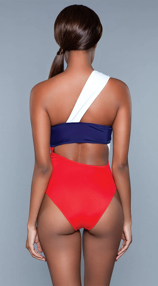 Take shape in this sophisticated one piece swimsuit featuring a bandeau style bust with a one shoulder strap, a cut-out bodice, and a cheeky cut back.